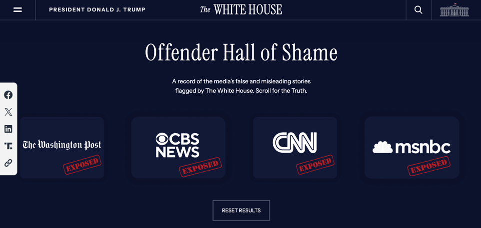 In questa pagina del sito della Casa Bianca, testate come il The Boston Globe, CBS News, The Independent, The Washington Post, CNN, Mcnbc, vengono esposte nella ‘Offender Hall of Shame’: una bacheca della vergogna in cui i giornalisti vengono esposti con nomi e cognomi.